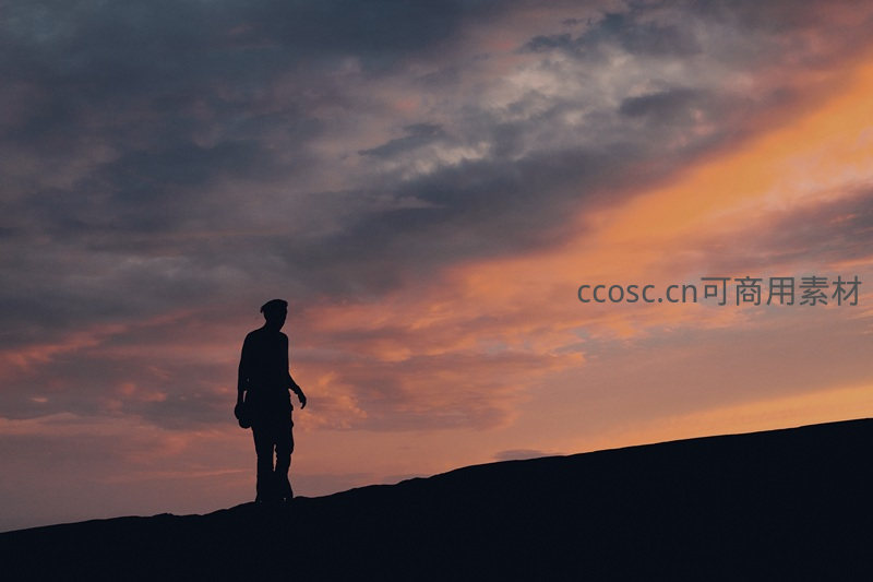一人独自站在山脊上,被绚烂的晚霞染成黑色剪影,广阔的天空与流动的云层衬托出生命的渺小与壮阔,充满哲思意境。