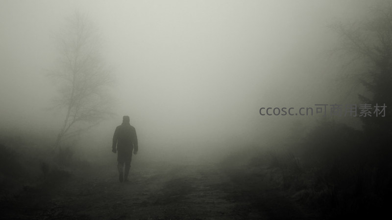 浓雾弥漫林间小径,孤影踽踽独行其中