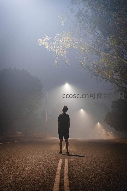 深夜浓雾笼罩街道,一人背对镜头伫立路中,路灯穿透薄雾洒下光晕,四周树木朦胧,营造出宁静而略带神秘的氛围。