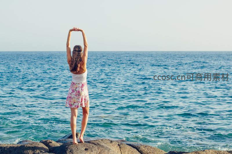 一位年轻女子赤脚站在海边岩石上,双臂高举伸展,面朝蔚蓝大海,享受着海风与阳光,展现出自由、惬意的度假时光。