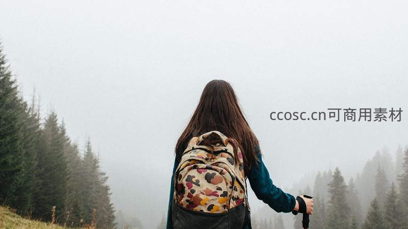 一位背着花色背包的徒步者站在雾气弥漫的山间,手持登山杖,凝望前方被薄雾笼罩的茂密松林,氛围宁静而充满探索感。