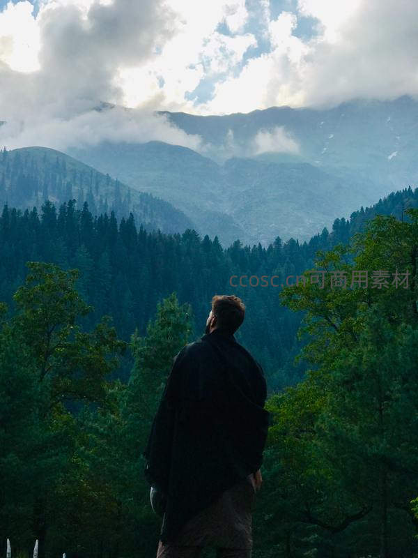 一名男子披着深色斗篷,伫立于葱郁林间,仰望着远处云雾缭绕、层峦叠嶂的山脉,画面充满敬畏与自然之美。