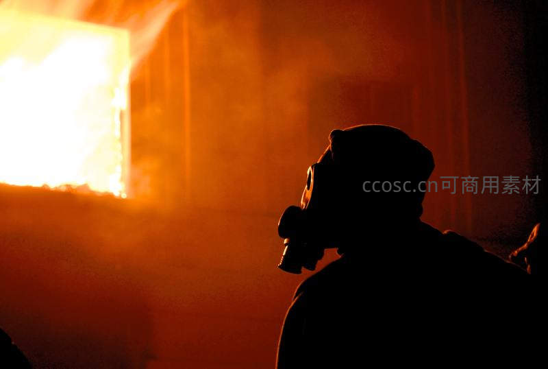 浓烟烈火中,消防员佩戴呼吸器的黑色剪影坚定矗立,橙红火光映照其轮廓,展现灾难现场无畏逆行的震撼力量。