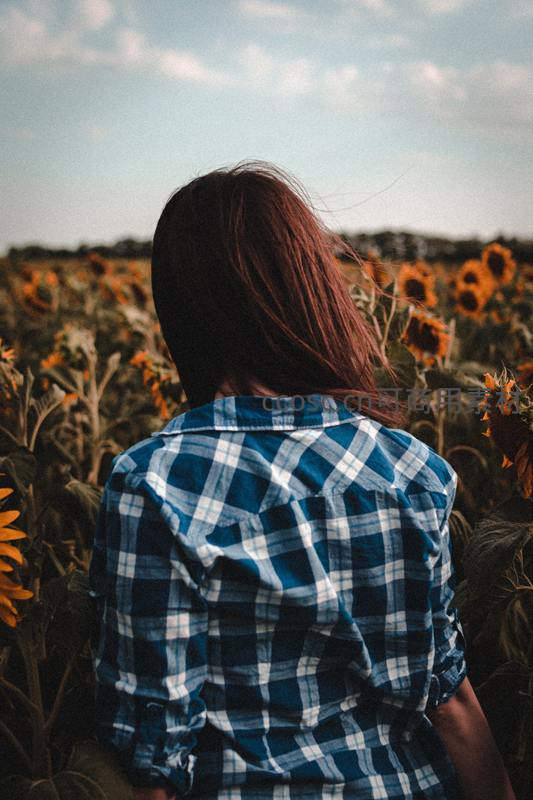 向日葵田中的格子衫少女背影