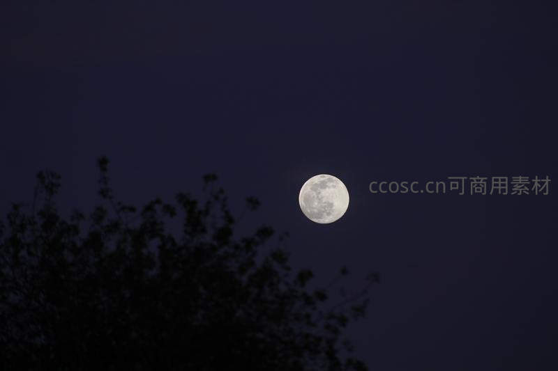 树影下的皎洁满月夜空