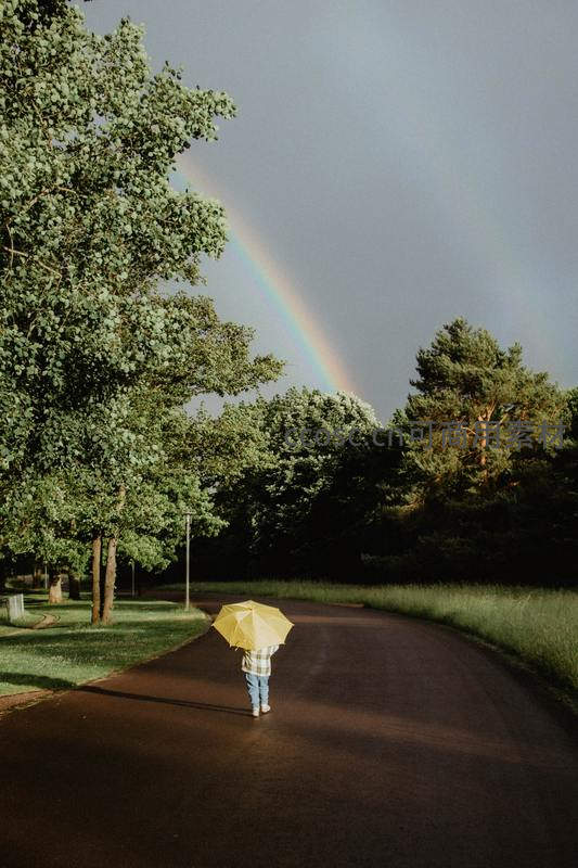 雨后天晴,一道绚丽彩虹横跨天空,一个孩子撑着黄色雨伞独自走在林荫小道上,四周绿树成荫,氛围梦幻而安详。
