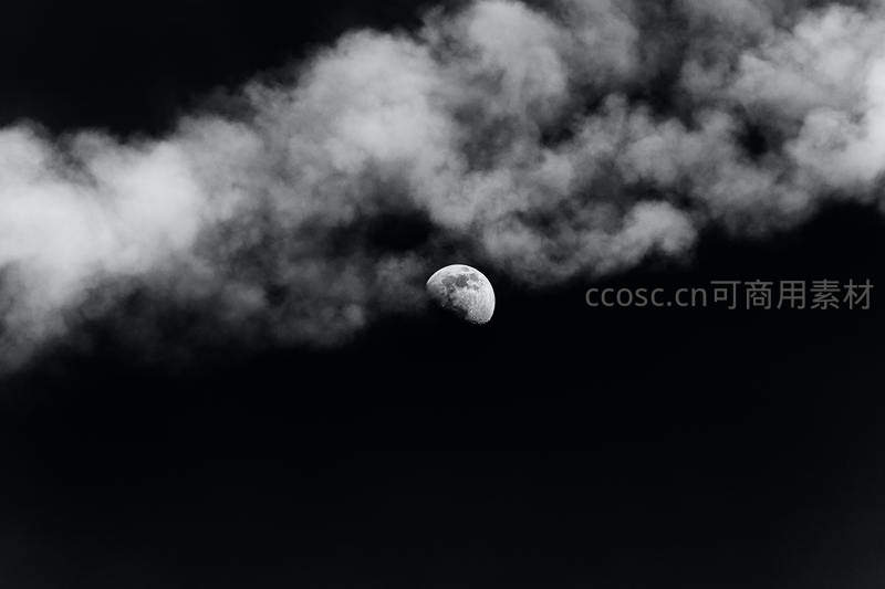 在浓密的云层缝隙中,一弯月牙若隐若现,黑白对比强烈,赋予画面一种超现实的神秘艺术感。