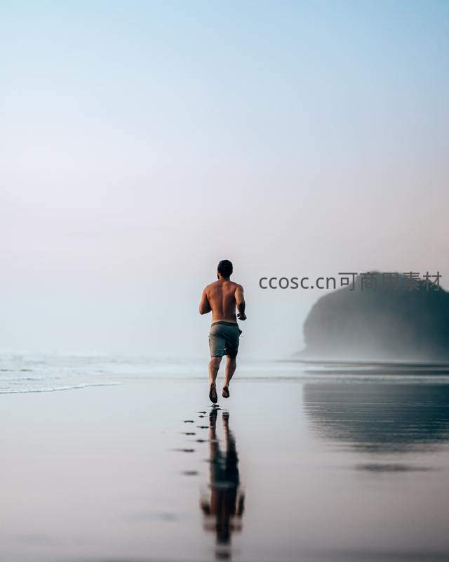 一名男子在湿润的沙滩上迎着晨光奔跑,身后留下清晰脚印与倒影,远处山峦在薄雾中若隐若现,画面充满动感与诗意。