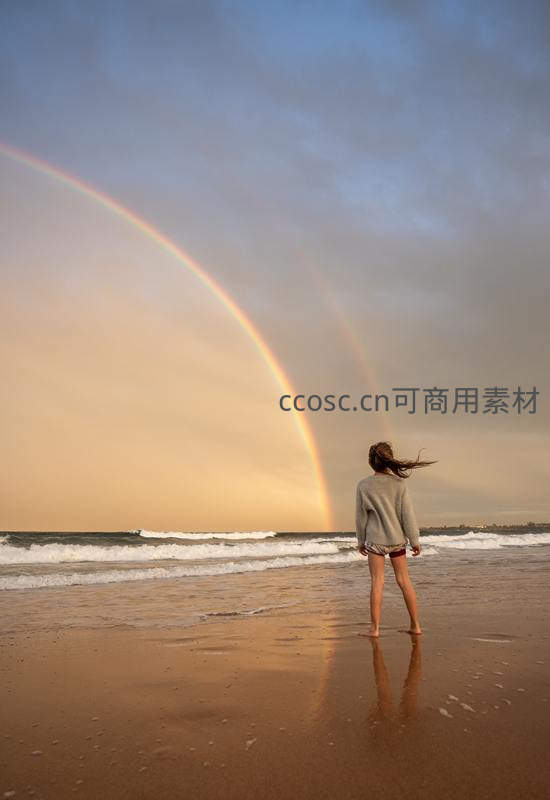 女孩赤足站在海边,仰望天际双道彩虹横跨云层,金色余晖洒满沙滩,微风吹动长发,画面充满童话般的浪漫与自由气息。
