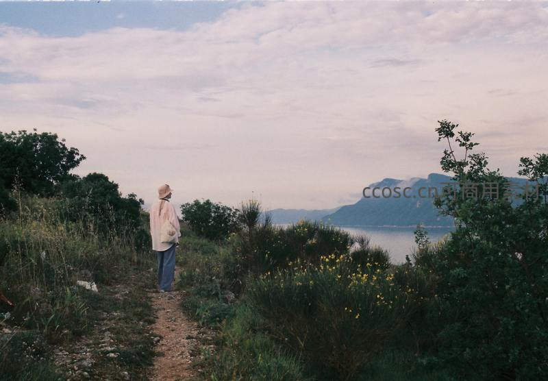 一位旅人沿山间小径驻足远眺,眼前是云雾缭绕的湖光山色,身旁野花盛开,绿意盎然,营造出远离尘嚣、亲近自然的悠然意境。
