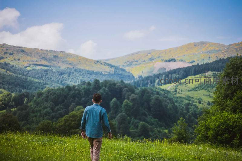 一位男子背对镜头,站在开满野花的草地上,远眺层叠起伏、绿意盎然的群山,天空晴朗,充满自由与宁静的氛围。