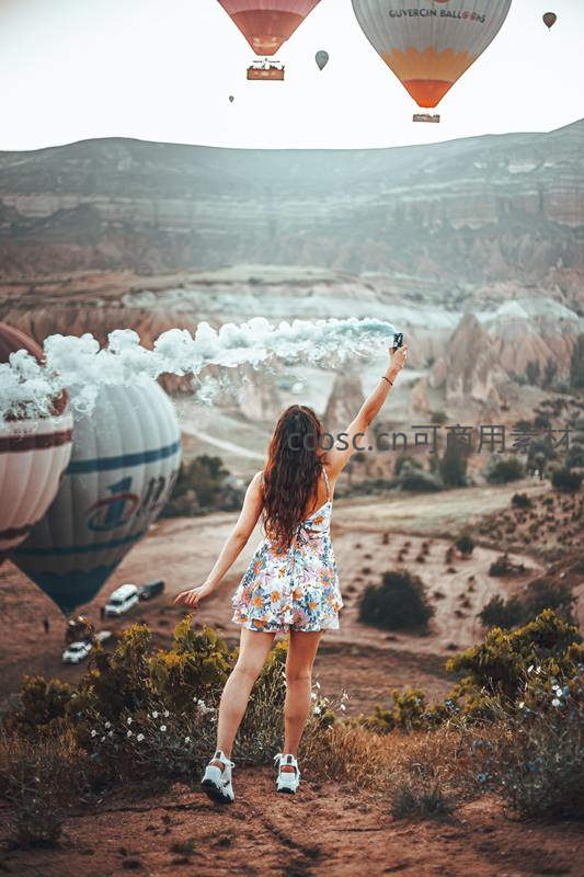 一位女游客站在卡帕多西亚的奇特地貌前,举起手机拍摄空中飘浮的热气球,记录下梦幻般的异国旅行瞬间。