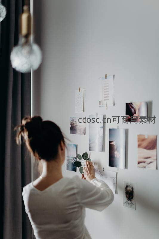 女子正将一张带有绿叶的照片贴上墙面,周围已布置好各类图片与手稿,搭配简约吊灯,打造一个充满个人风格、激发创造力的私密工作角落。