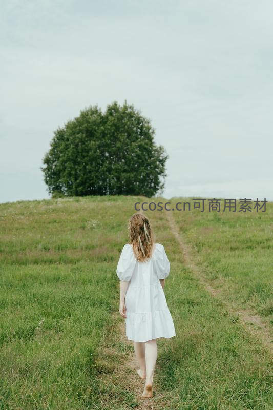 一位身穿白色连衣裙的女子赤脚走在绿意盎然的草坡小径上,前方远处一棵独立大树矗立山顶,整个画面空灵静谧,充满治愈与遐想空间。