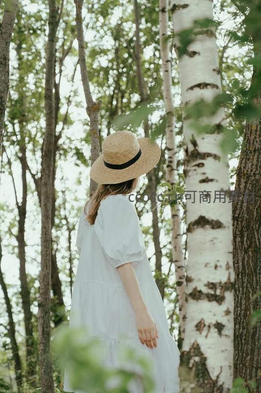 一位身穿白色连衣裙、头戴草帽的少女在白桦林中缓步前行,阳光穿过枝叶洒下斑驳光影,营造出静谧而诗意的氛围。