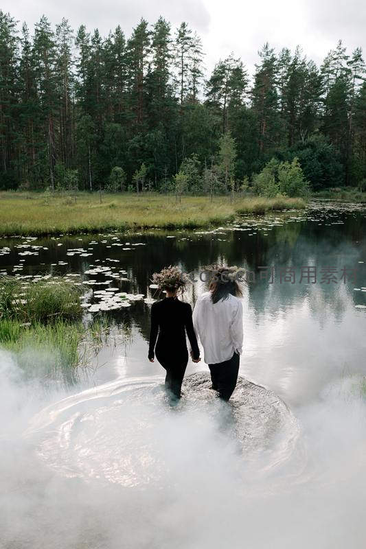 一对情侣手牵手行走在薄雾缭绕的湖面之上,四周松林环抱,水面漂浮睡莲,营造出如梦似幻、浪漫唯美的意境。