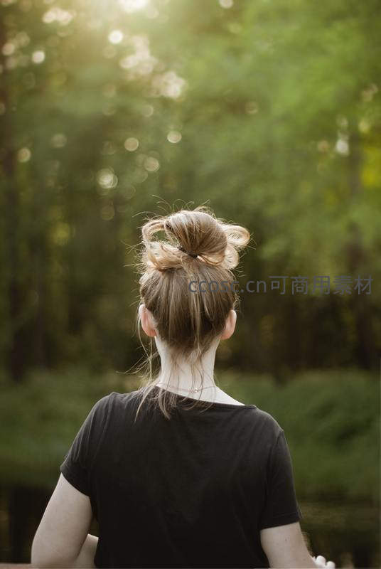 一位女性背对镜头站在林中,阳光透过树叶洒下斑驳光影,营造出静谧而温暖的氛围,展现人与自然的和谐。