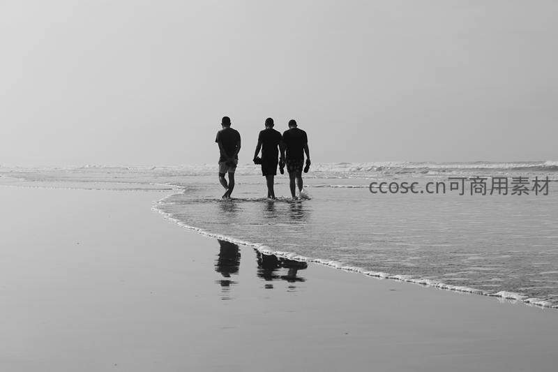 三位朋友在湿润沙滩上并肩行走,身后是温柔的海浪和清晰倒影,黑白影像更显时光沉淀与友情珍贵。