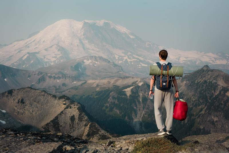 徒步者背负行囊立于山巅,凝视远方巍峨雪峰,阳光洒落山峦间,展现征服自然、拥抱壮丽景色的冒险精神与自由心境。