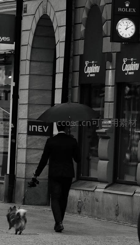 一位身着西装的男士撑着黑伞,牵着一只小型犬,在铺满石板的欧洲风格街道上缓步前行,背景是典雅的拱门建筑与品牌橱窗。