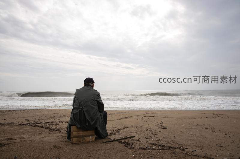 一名男子独自坐在沙滩上的木箱上,背对镜头凝望翻涌的海浪与灰蒙天空,传递出宁静、孤独与沉思交织的内心世界。