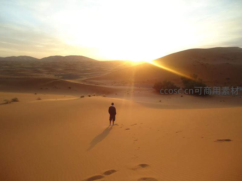 一人背对镜头站在无垠的金色沙漠中,脚下是延伸的脚印,落日余晖洒满沙丘,远处山峦起伏,营造出壮阔又寂寥的视觉感受。