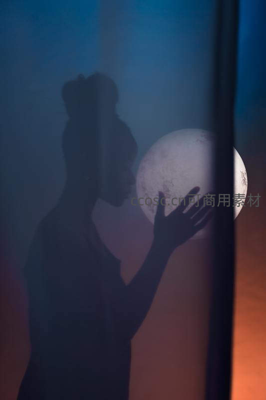 一位女子的侧影在朦胧光影中伸手轻触一轮巨大的月球,虚实相生,营造出超现实的浪漫与诗意氛围。