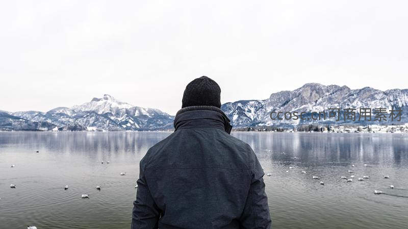一名男子穿着厚实冬装站在结冰湖边,远眺白雪覆盖的巍峨群山,湖面倒映着天空与山峦,几只水鸟点缀其间,尽显冬日苍茫与孤寂。