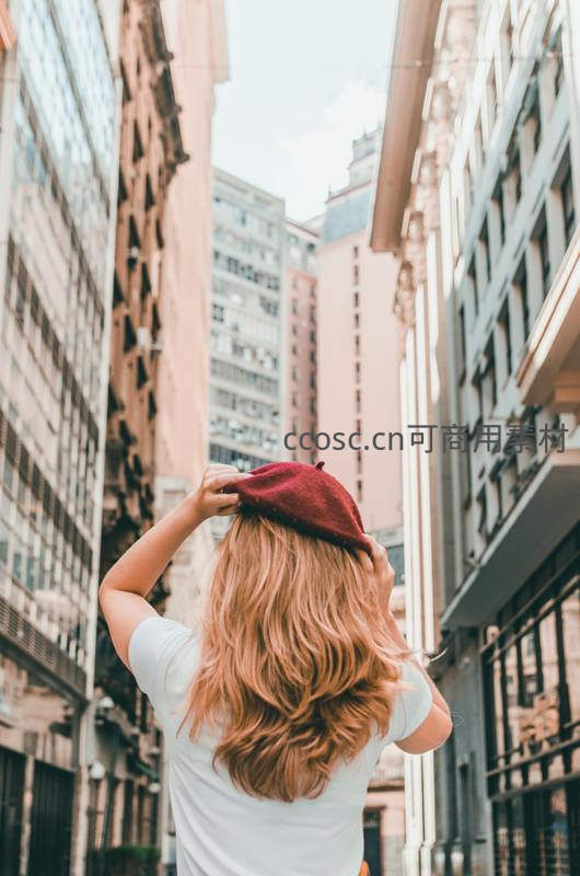 一位戴着红色贝雷帽的少女从背后看去,正走在两排高耸现代楼宇之间的狭窄街道上,阳光洒在她金色卷发上,充满都市探索的活力与文艺气息。