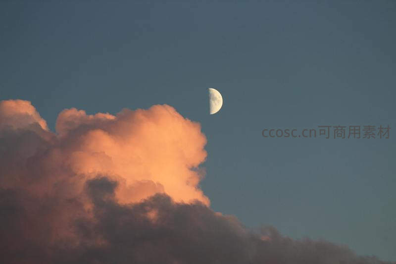 半轮明月从绚烂的晚霞云海中探出头来,金色云层与清冷月光形成鲜明对比,构成一幅动人心魄的暮色画卷。