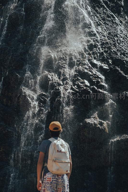 一位戴着帽子、背着背包的旅人驻足于高耸的岩壁前,仰头凝视着从峭壁奔流而下的壮观瀑布,水花四溅,充满自然的力量感。