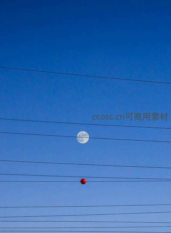 湛蓝天空下,一轮明月与一颗鲜红小球被几条平行电线巧妙分隔,形成极具视觉冲击力的几何构图与色彩对比。