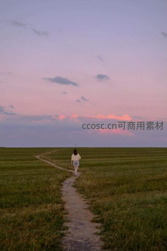一人沿着蜿蜒土路走向远方,广袤绿野与粉紫晚霞相映成趣,营造出静谧而治愈的氛围。