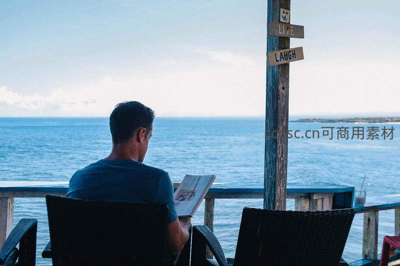 男子坐在海边露台椅上专注阅读报纸,身旁木桩标有“LIVE LAUGH”,蔚蓝大海延伸至天际,传递悠闲自在的生活态度。