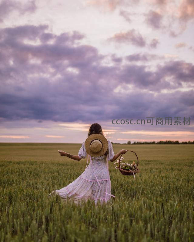 一名身着白色长裙、头戴草帽的女子背影行走在无垠麦田中,手提一篮鲜花,仰望天空绚丽的晚霞。画面充满诗意与自由感。