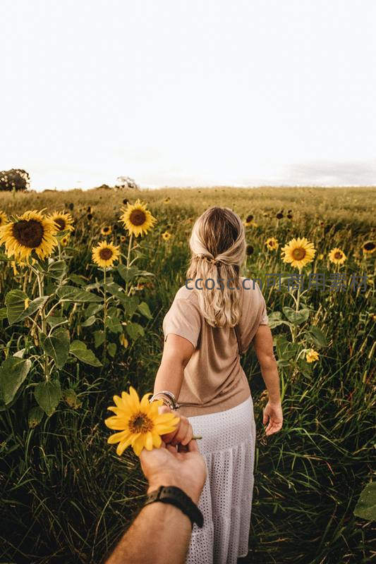 向日葵花海中牵手漫步的浪漫背影