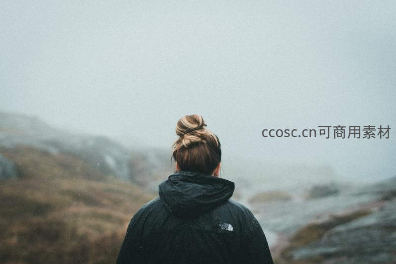 一位扎着丸子头的女子身穿黑色冲锋衣,伫立在浓雾弥漫的山野间,凝视远方,充满宁静与思索的意境。