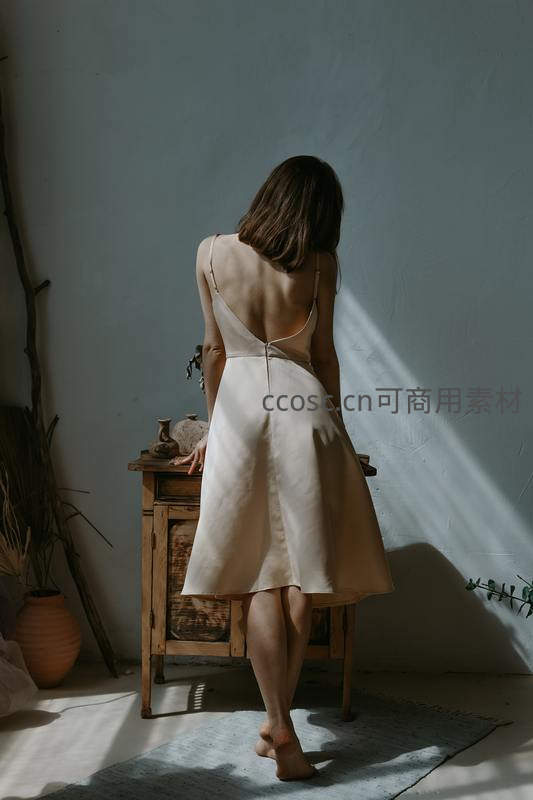 一位穿着米色露背吊带裙的女子站立于光影交错的房间内,阳光从侧方投射,勾勒出她优美的线条和宁静的氛围。