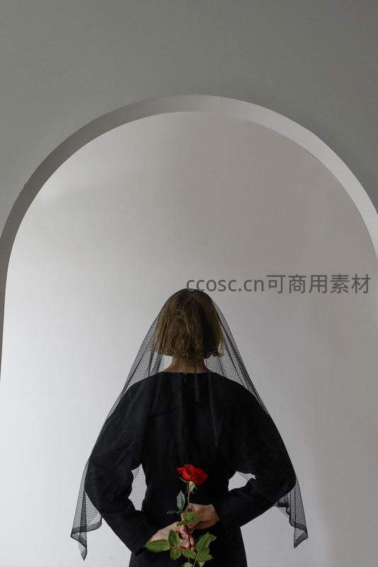 一位身披黑色薄纱、手持鲜红玫瑰的女子背对镜头站立于白色拱门前,简约构图与色彩反差突出其神秘与庄重感,传递出非传统婚礼的浪漫与深邃。
