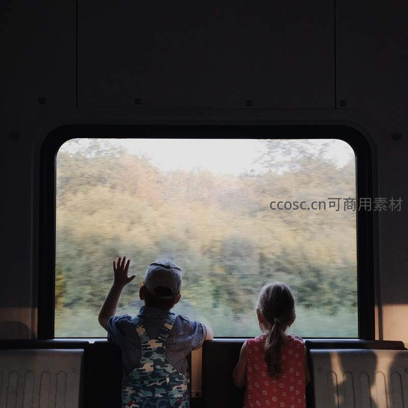 两个孩子坐在行驶的火车内,男孩挥手向窗外致意,女孩静静凝望飞逝的树林,车厢内光线柔和,记录了旅途中的童真与对世界的好奇探索。