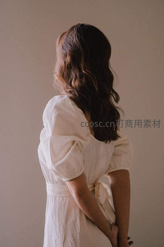 一位身着纯白色泡泡袖连衣裙的女子背对镜头,柔顺的卷发垂在肩头,整体造型简约而富有女性魅力。
