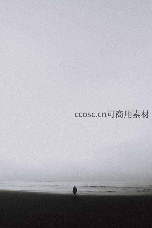 浓雾笼罩的海滩上,一个渺小的身影独自走向海天相接处,画面空旷而宁静,传递出强烈的孤独与沉思感。