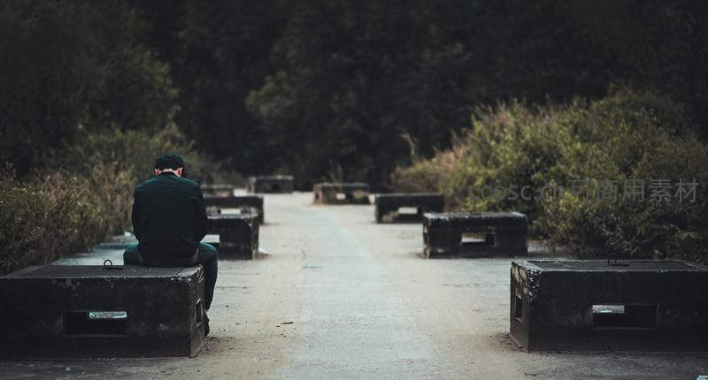 一名男子独自坐在一条布满混凝土路障的废弃道路上,四周是茂密的树林,冷峻的色调和空旷的场景烘托出强烈的孤独感与沉思氛围。