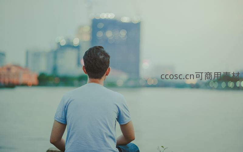 一位年轻人背对镜头坐在水边,凝望远处灯火朦胧的城市天际线,画面充满静谧与思索的氛围。