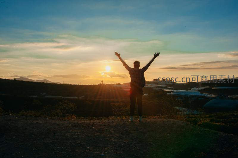 一人立于山顶,双臂张开拥抱夕阳,金色光芒穿透云层洒下,背景是连绵山丘与田园,象征自由与希望。