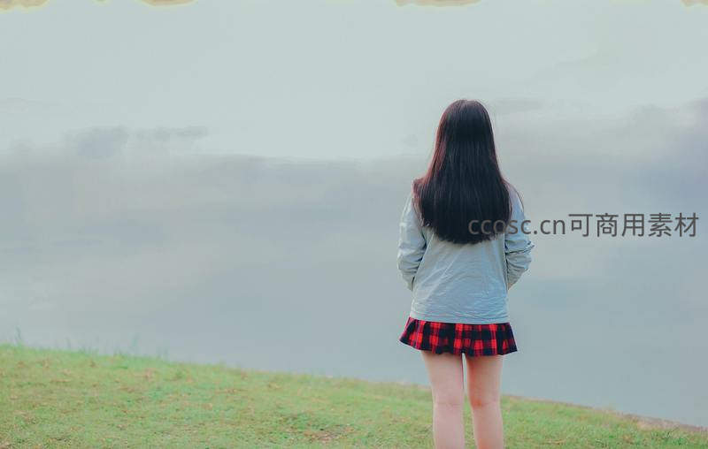 长发少女独自站在绿草坡上,背对镜头望向灰蒙天空与平静湖面,营造出安静、略带忧郁的文艺氛围。