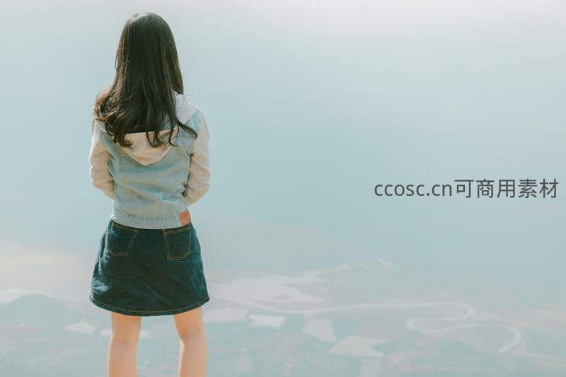 一位长发少女身着牛仔外套与短裙,背对镜头伫立山巅,凝视着脚下被薄雾笼罩的广阔山谷,画面宁静而富有诗意。