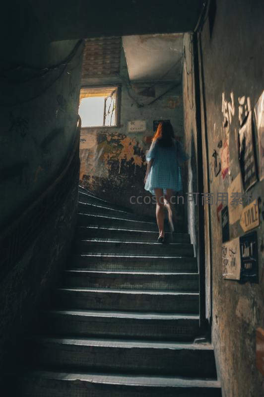 一位红发女孩穿着蓝色连衣裙,正沿着昏暗破旧的楼梯向上行走,墙上的涂鸦和窗户透入的光线交织,营造出怀旧神秘的氛围。