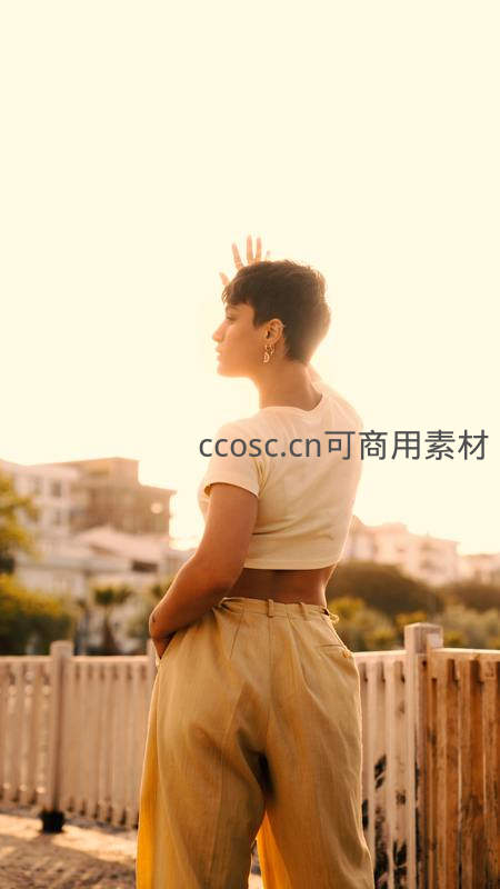 一位留着利落短发的女子侧身站立,阳光从背后洒下,勾勒出她优雅的轮廓,背景是朦胧的城市建筑,充满温暖与惬意感。