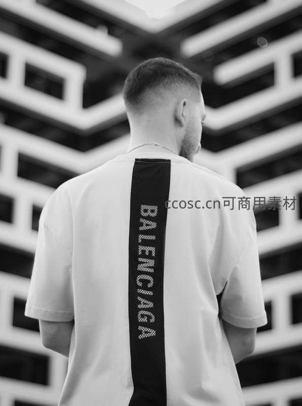 一位男士身着印有品牌标识的白色T恤,背对镜头站立于几何线条感强烈的现代建筑前,展现都市时尚与建筑美学的融合。